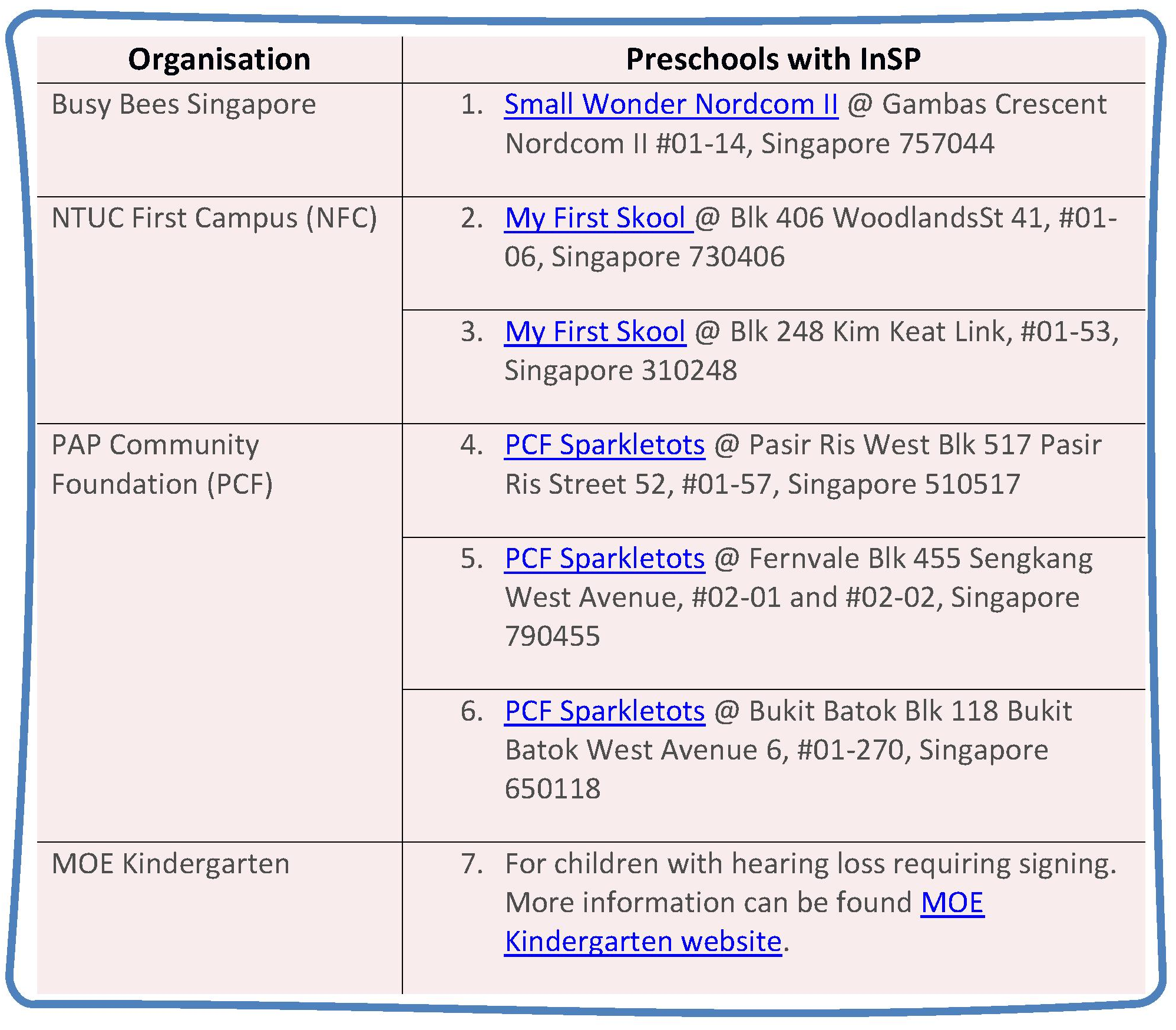 The InSP pilot provides an inclusive learning experience by integrating both early childhood education and early intervention in a preschool setting. This helps enhance children's engagement and holistic development while reducing logistical challenges for families. The following preschools offer the InSP: