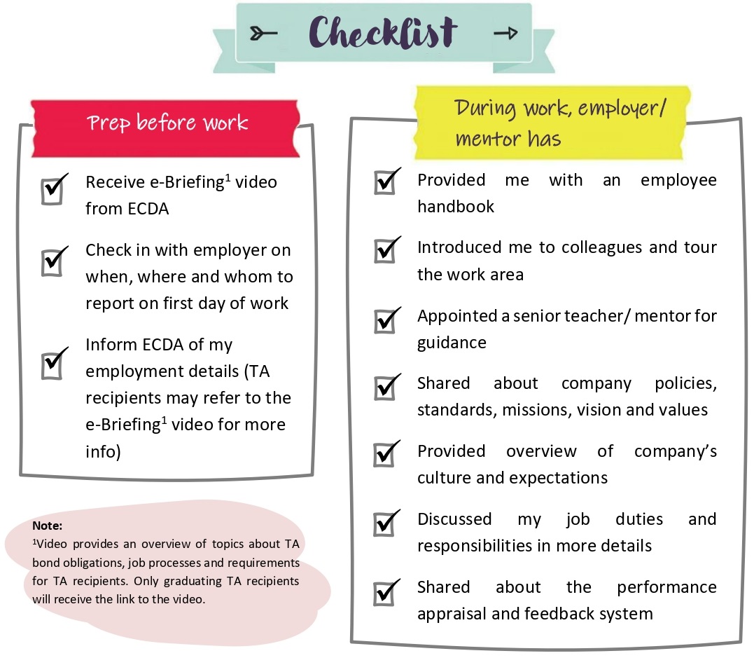 When you start a new job, it is normal to feel some level of uncertainty. This checklist serves as guide to help you better assimilate into the new working environment. Your centre may have different induction programmes for new staff. We encourage you to communicate with your employer to find out more.