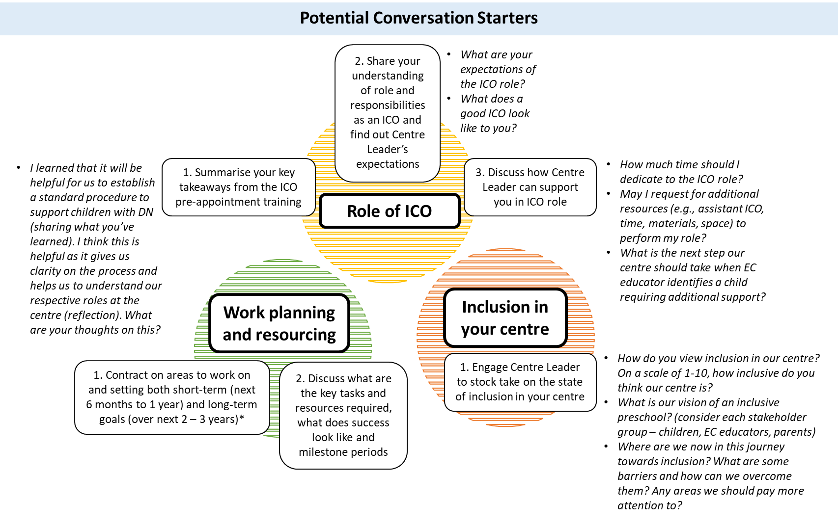To kick start the inclusion journey in your centre, it is important to check in with your centre leader on their expectations of the ICO role and direction for the centre. The following provides you with a possible roadmap on how to kick start the conversation with your centre leader.